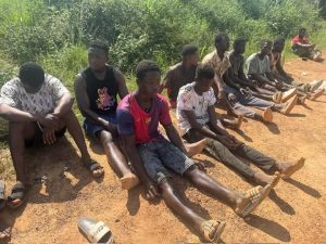 While travelling along the Goaso to Hwidiem highway, the Director’s attention was drawn to an excavator engaged in mining along the roadside near Bronikrom. The team diverted to the location and apprehended several individuals actively mining. The Director instructed the suspects to refill the pits they had dug to prevent further environmental degradation.