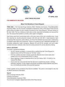 The Food and Drugs Authority (FDA), in collaboration with the Fisheries Commission, the Tema Metropolitan Assembly (TMA), and the Criminal Investigations Department (CID) of the Ghana Police Service, has uncovered a mass fish mortality incident at the Tema Shipyard. This discovery was made on April 6, 2026, and a joint statement was issued on April 9, urging the public to avoid consuming fish from the affected area.