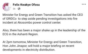The Minister for Energy and Green Transition, John Abdulai Jinapor, has directed the Chief Executive Officer of the Ghana Grid Company Limited (GRIDCo) to step aside pending an investigation into a fire at the Akosombo Power Control Centre.