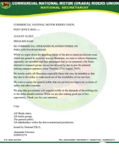 The Commercial National Motor Riders Union (Okada) has distanced itself from an upcoming strike planned by transport operators on the Pokuase–Nsawam road, scheduled for Thursday, August 21, 2025.