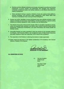 The directive, issued from the presidency, forms part of measures aimed at enforcing fiscal discipline and cutting down on non-essential public spending.