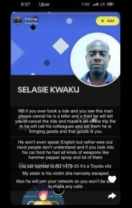 Stephanie claimed she saw a rag and hammer in the vehicle’s boot, and a verbal altercation occurred when the driver stopped at the Toyota Motors Roundabout. She exited the vehicle and later shared a screenshot of the driver’s profile with her younger sister, Promise.